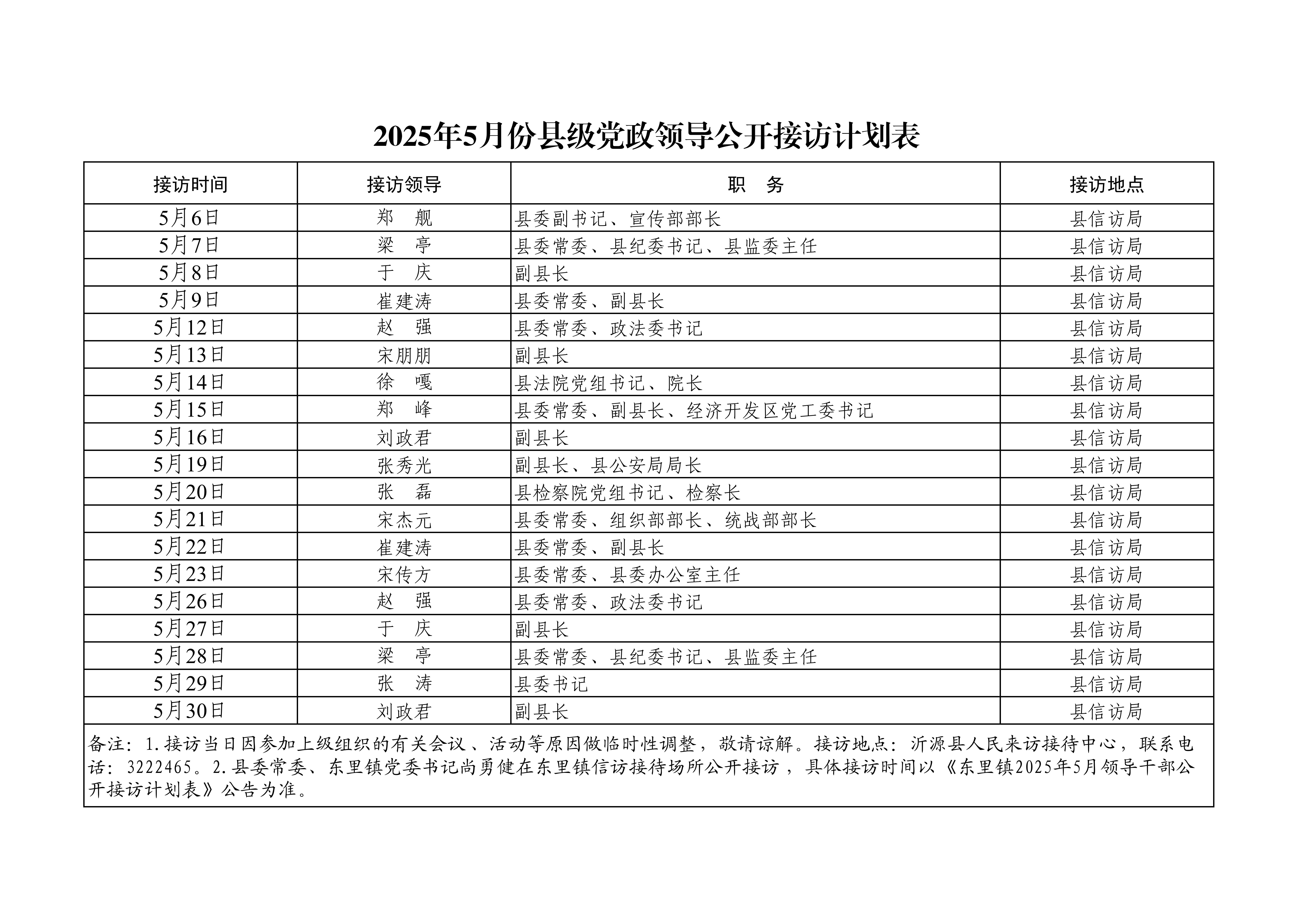2025年5月份县级党政领导公开接访计划表