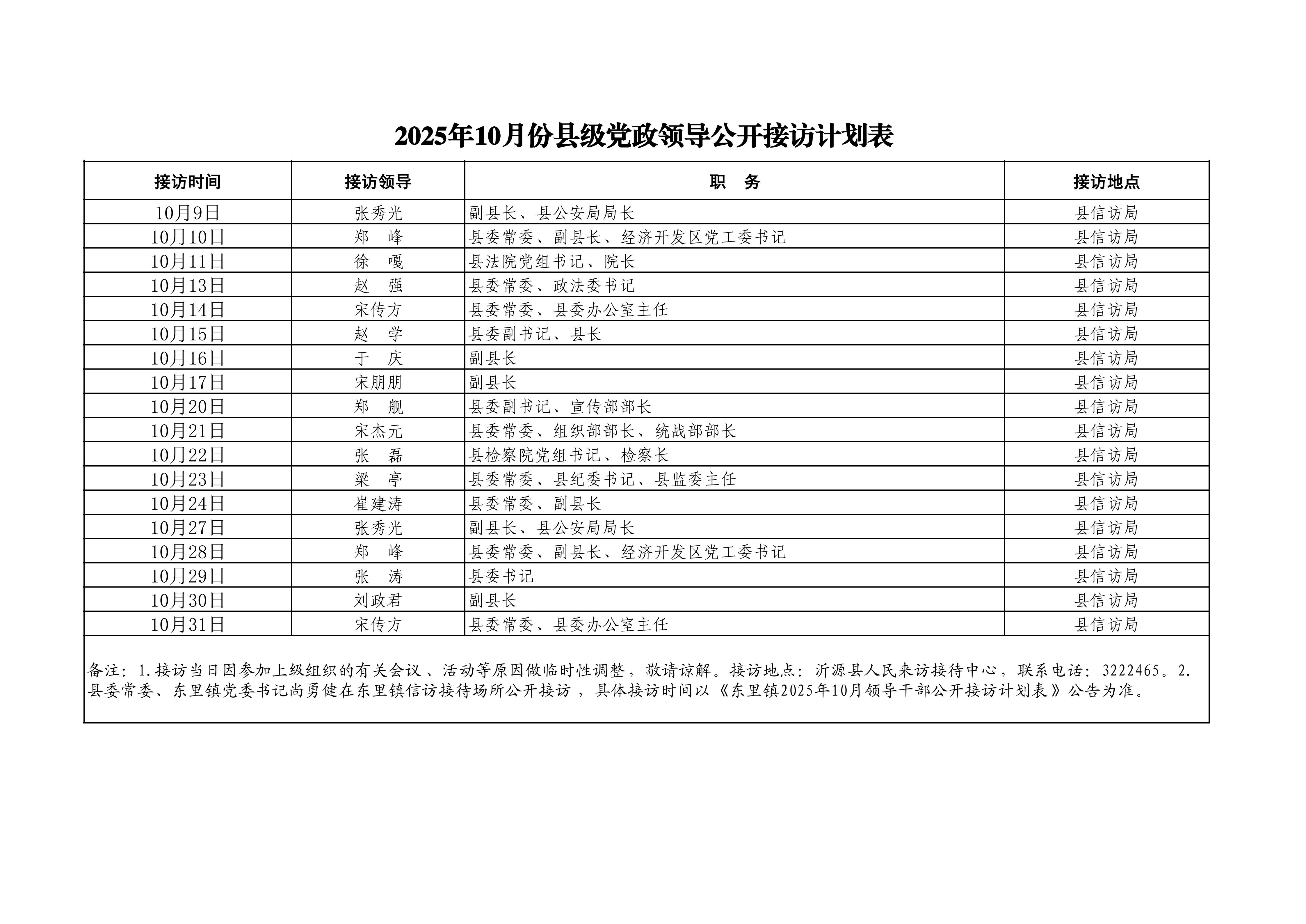2025年10月份县级党政领导公开接访计划表
