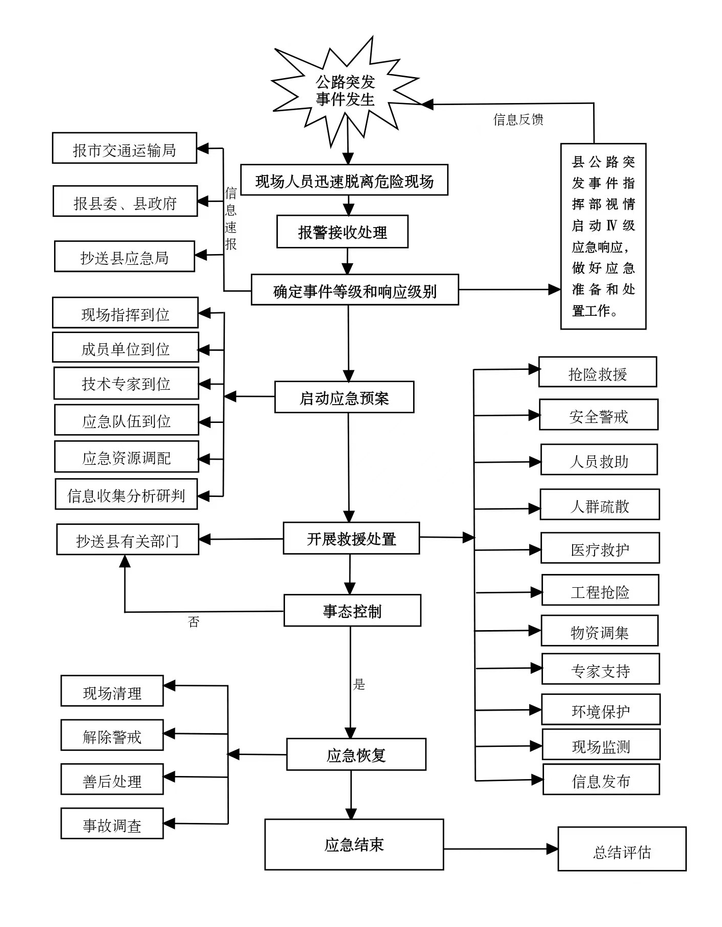 (3)根据公路突发事件发生情况,统一部署有关应急实施工作,决定启动和终止Ⅳ级公路突发事件预警状态和应急响应行动,全面组织、协调、指挥公路突发事件的应急救援、善后处置、应急处置评估等工作,并对应急救援工作发生的意外情况,采取紧急处理措施。公路突发事件超出Ⅳ级应急范围时,及时上报提高应急响应级别。