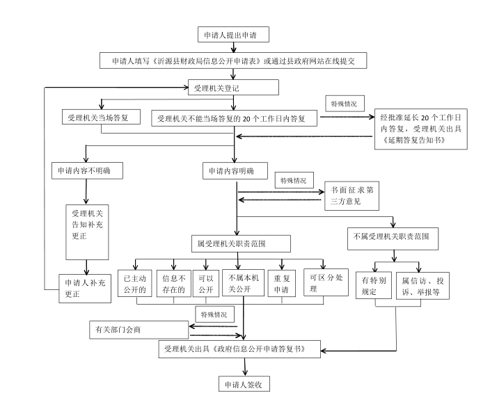 县政府及县政府工作部门办理申请人政府信息公开申请时,能够当场答复的,将当场答复;不能当场答复的,自收到申请之日起20个工作日内予以答复;确需延长答复期限的,延长答复时间不超过20个工作日,并告知申请人。政府信息涉及第三方权益的,应当征求第三方的意见,征求第三方意见所需时间不计算在期限内。