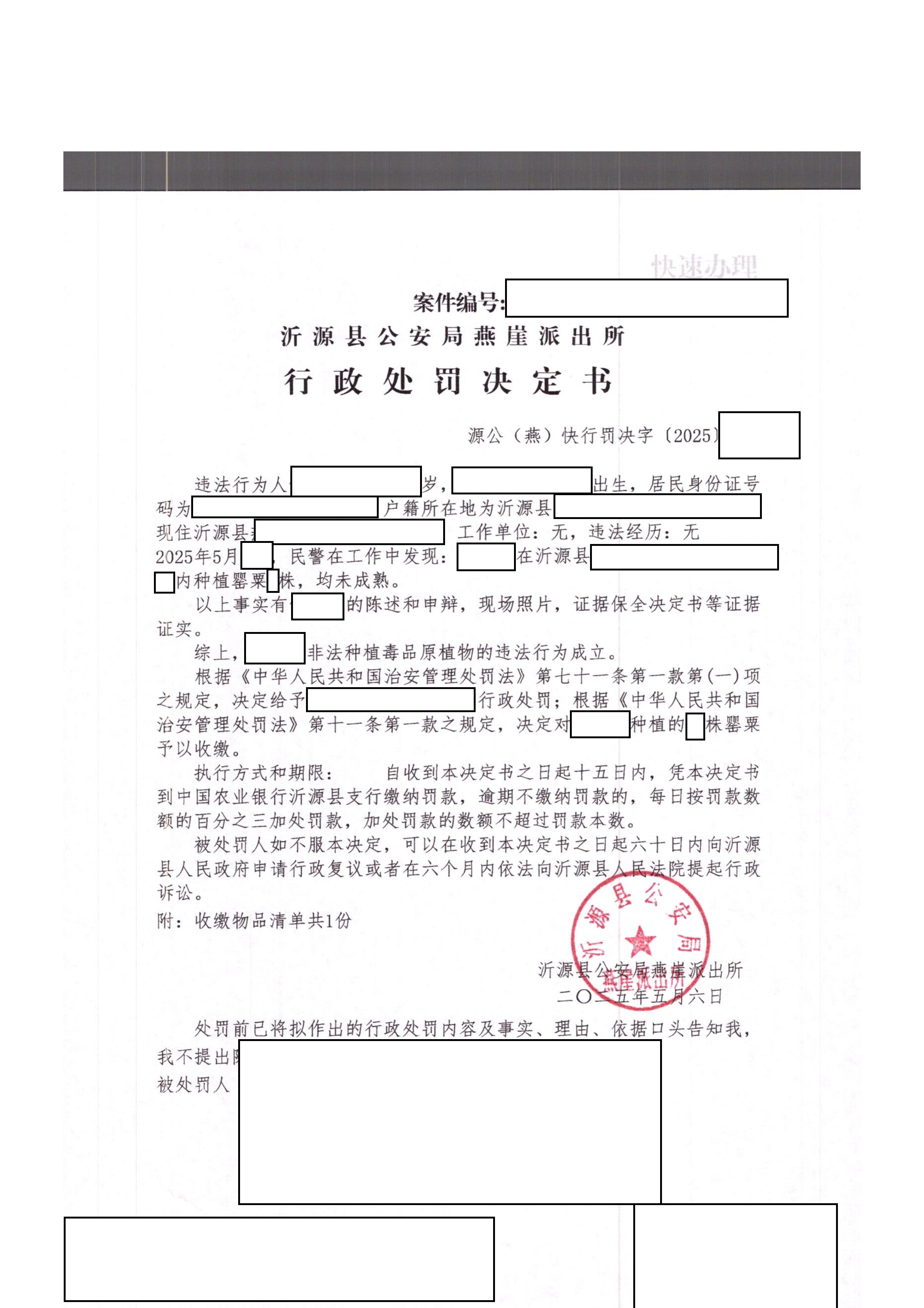 沂源县公安局2025年二季度行政处罚决定书