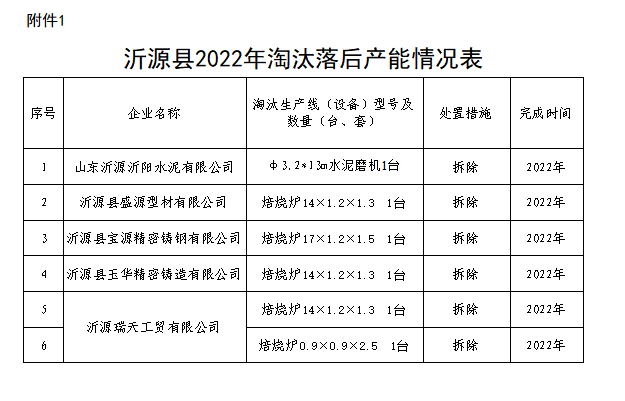 按照省、市、县推动落后产能退出工作要求,现将沂源县2022年度淘汰落后产能退出情况予以公告。