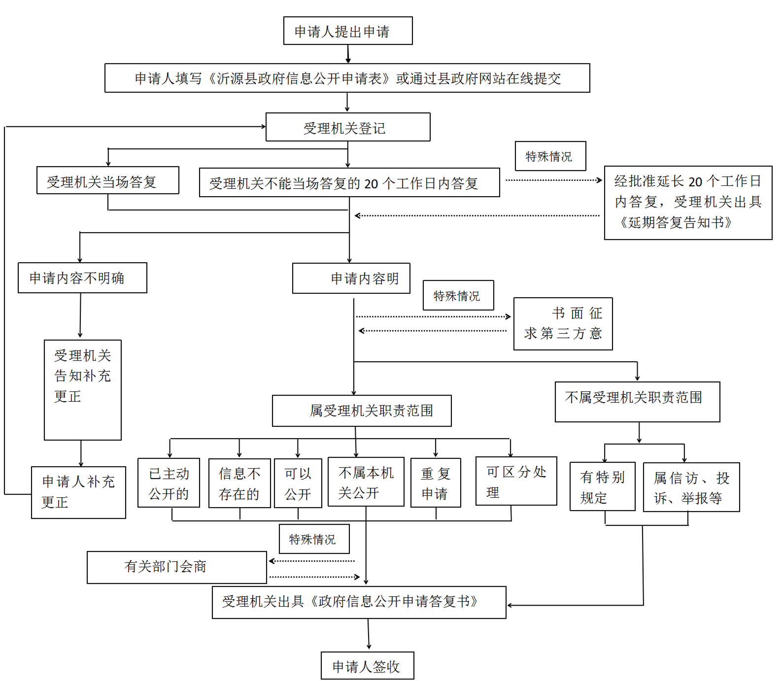 本机关办理申请人政府信息公开申请时,能够当场答复的,将当场答复;不能当场答复的,自收到申请之日起20个工作日内予以答复;确需延长答复期限的,延长答复时间不超过20个工作日,并告知申请人。政府信息涉及第三方权益的,应当征求第三方的意见,征求第三方意见所需时间不计算在期限内。