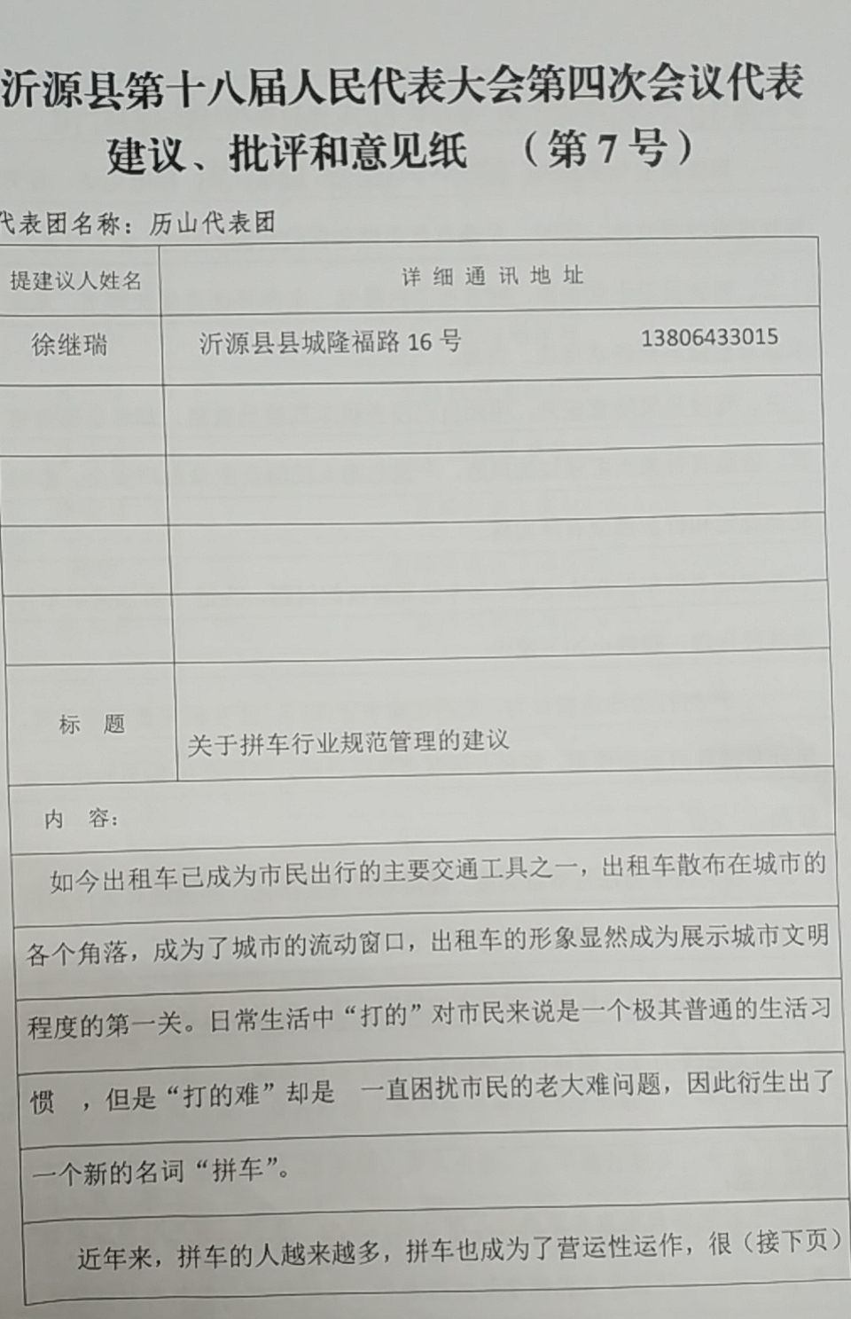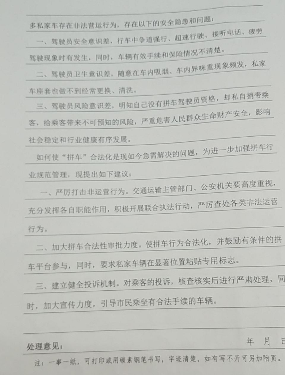 拼车是最近几年兴起的一种出行方式,对于减少路面上私家车数量,缓解城市交通拥堵,减少空气污染,节省整个社会资源等方面起到积极作用。但因缺乏法律规范管理,很多车主把此作为盈利手段,实施非法营运,存在很多的安全隐患和问题。您在人大代表建议中分析地很到位,也很全面,由于进行非法营运的车辆均为私家车辆,存在保险不齐全,有的只缴纳交强险,一旦发生交通事故,乘客的权益不能得到保障;车主未经专业培训,无载客经营从业资格证,安全意识、法制意识差,行驶安全无法得到保障,存在着很大的安全隐患。