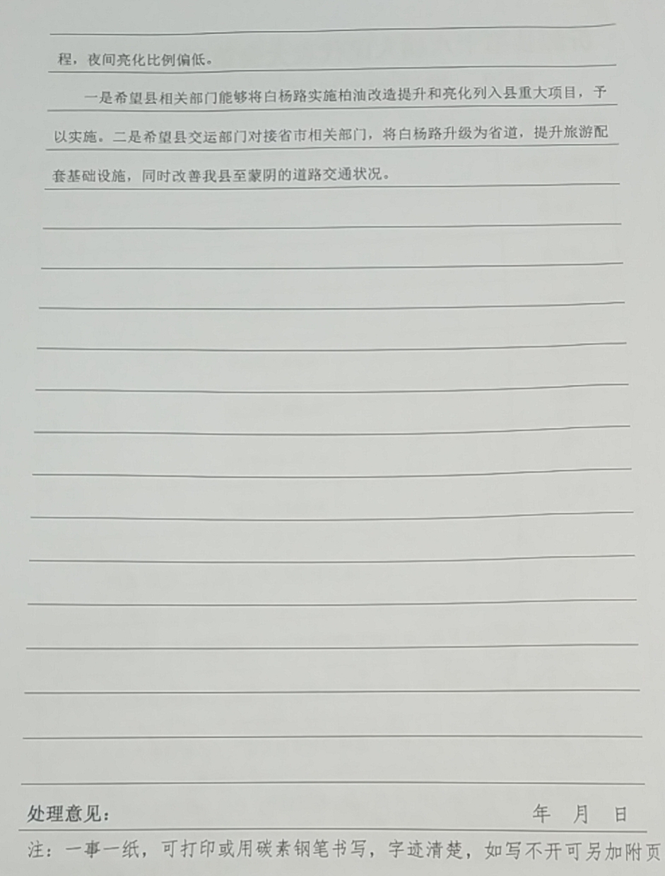三、关于白杨路升级为省道的问题:路网调整由交通运输部按照规划统一调整。县道升级为省道需具备相应条件,白杨路无论从社会需求还是技术指标目前还达不到省道标准。