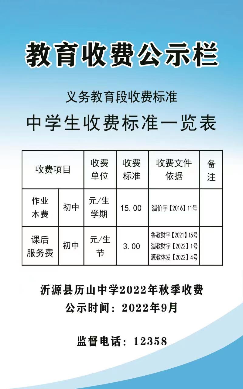 | 标题: | 沂源县历山中学 学校收费项目和标准 | ||
