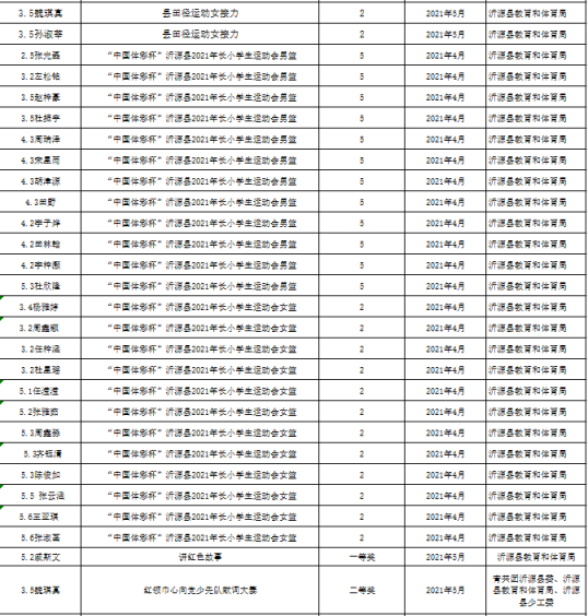 | 3.5孙淑莘 | 县田径运动女接力 | 2 | 2021年5月 | 沂源县教育和体育局 |