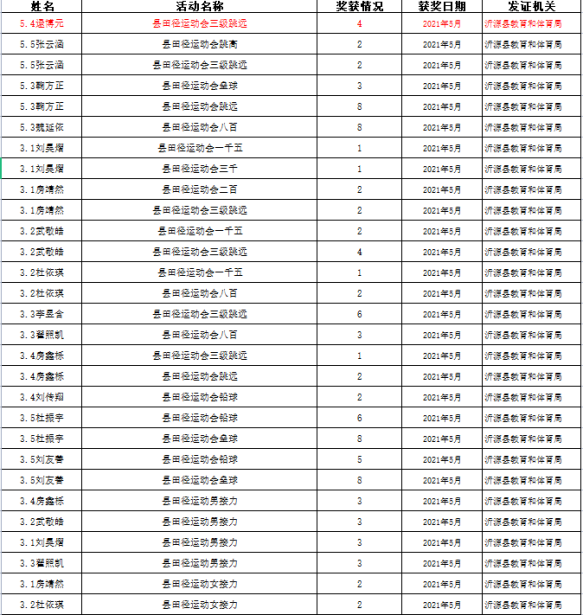 | 5.5张云涵 | 县田径运动会跳高 | 2 | 2021年5月 | 沂源县教育和体育局 |