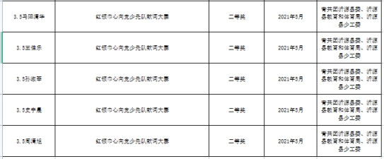 | 3.5孙淑莘 | 红领巾心向党少先队献词大赛 | 二等奖 | 2021年5月 | 青共团沂源县委、沂源县教育和体育局、沂源县少工委 |