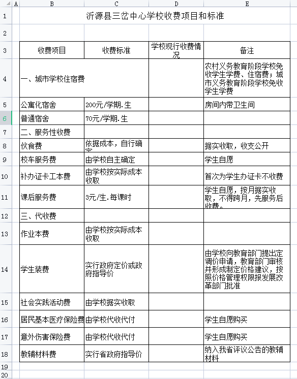 三岔中心学校收费项目标准
