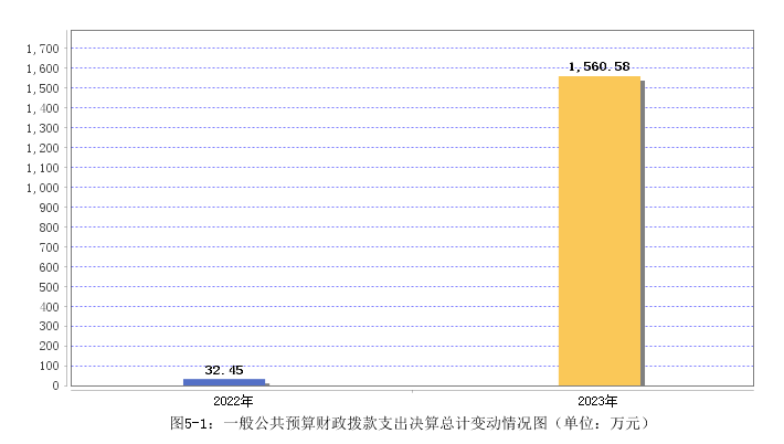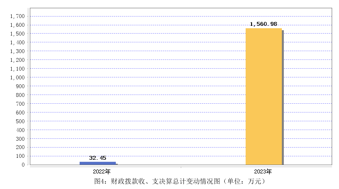 2023年度财政拨款收、支总计均为1,560.98万元。与2022年相比,财政拨款收、支总计均增加1,528.53万元,增长4710.42%。主要是沂源县荆山学校是2022年新建学校,从9月份开始招生,财务的有关手续到11月份办理完成,学校经济业务从12月份开始,业务量较少,2022年财政拨款收入32.45元;2023年财政拨款收入1560.98万元,占比100%,比去年增加