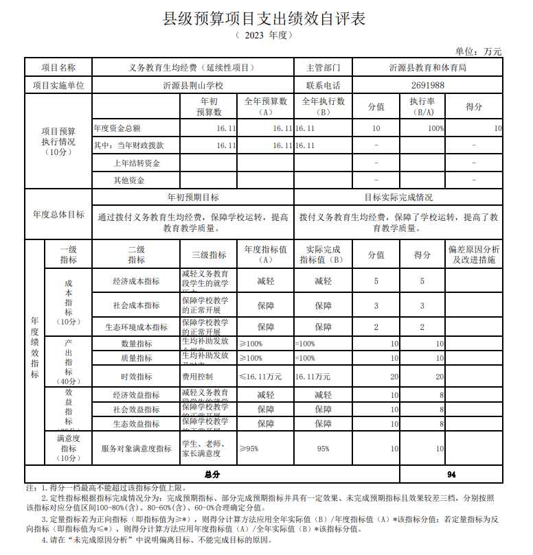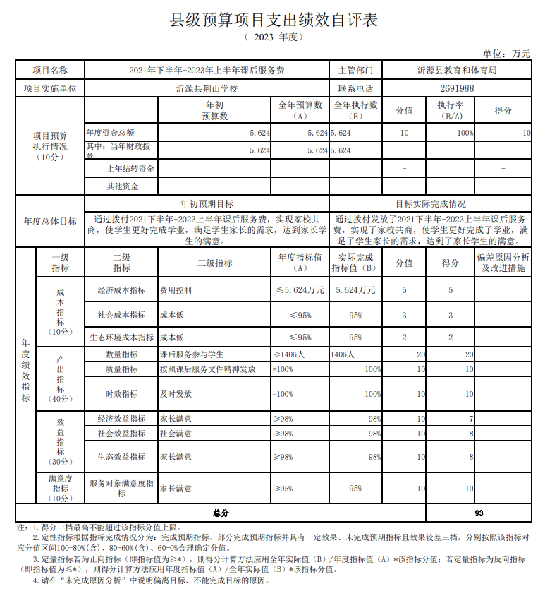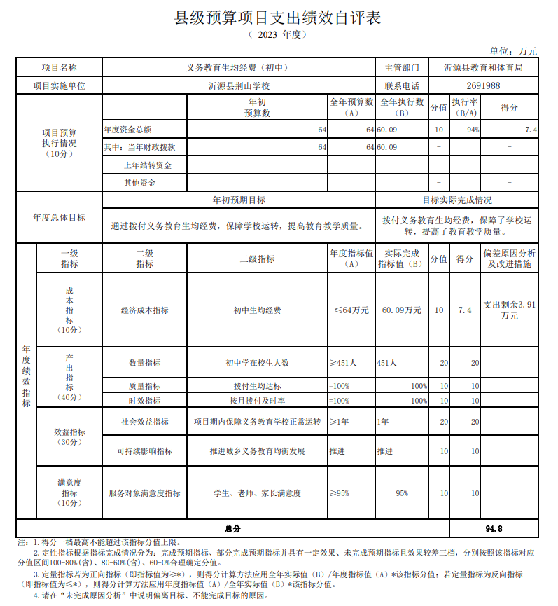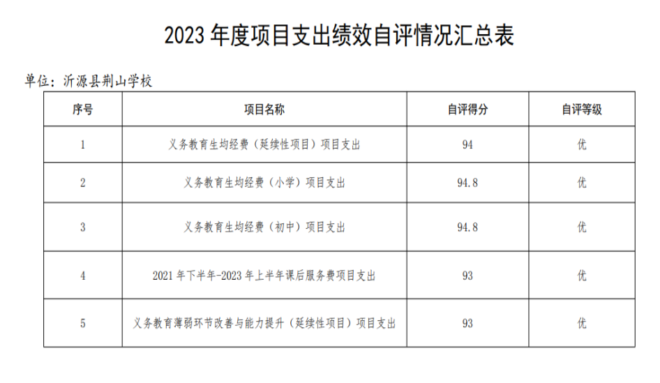 (二)县级预算项目绩效自评结果。沂源县荆山学校2023年度县级预算绩效自评的5个项目中,5个项目自评等级为优。从自评情况看,项目支出绩效管理的重视程度进一步提升,项目有序开展,执行和完成情况较好,资金使用比较规范,但也存在项目实施进展比较慢等问题。