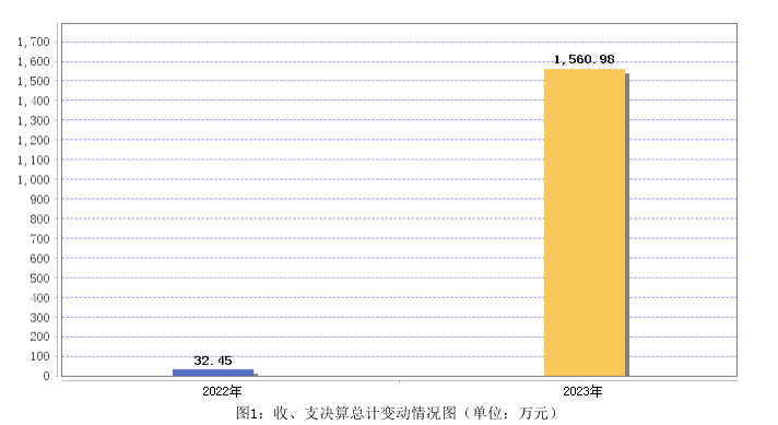 2023年度收、支总计均为1,560.98万元。与2022年相比,收、支总计均增加1,560.98万元,增长100%。主要是沂源县荆山学校是2022年新建学校,从9月份开始招生,财务的有关手续到11月份办理完成,学校经济业务从12月份开始,业务量较少,2022年财政拨款收入支出32.45万元;2023年财政拨款收入支出1560.98万元,比去年增加。
