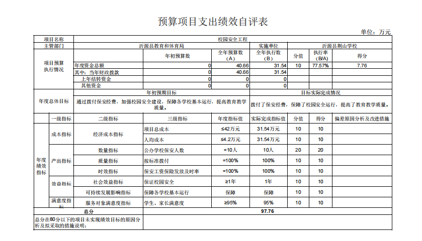 1.“ 109567沂源县荆山学校_项目校园安全工程”项目绩效自评综述:根据年初设定的绩效目标,项目自评得分为97.76分。全年预算数为40.66万元,执行数为31.54万元,完成预算的77.57%。项目绩效目标完成情况:拨付了保安经费,保障了校园安全运行,提高了教育教学质量。发现的主要问题及原因:执行数执行率有待提高。下一步改进措施:进一步做好项目预算。