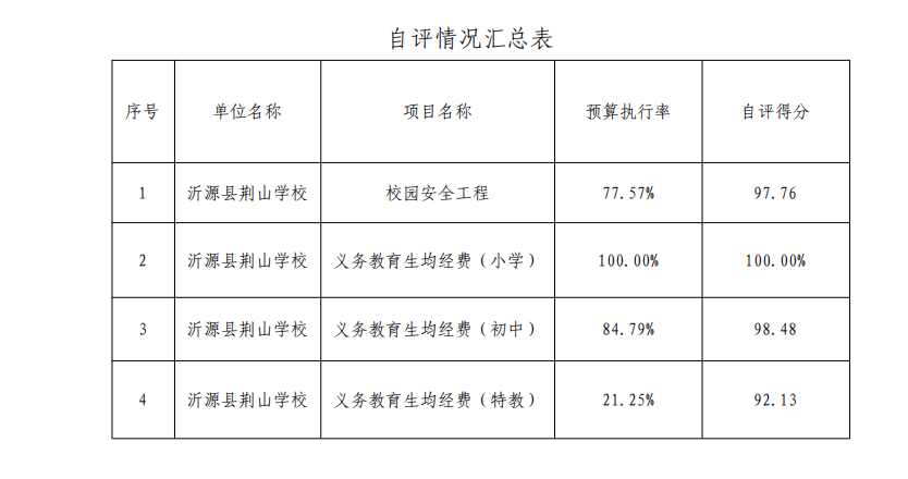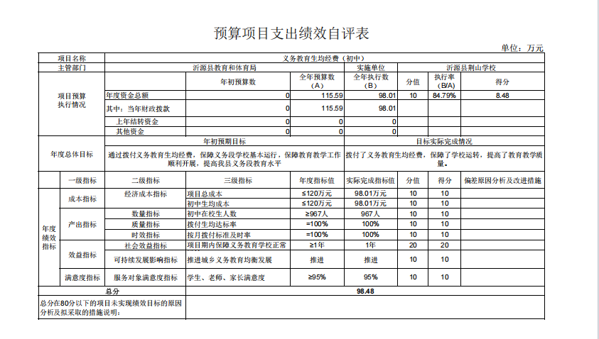 3.“109567沂源县荆山学校_项目义务教育生均经费(初中)”项目绩效自评综述:根据年初设定的绩效目标,项目自评得分为98.48分。全年预算数为115.59万元,执行数为98.01万元,完成预算的84.79%。项目绩效目标完成情况:拨付了义务教育生均经费,保障了学校运转,提高了教育教学质量。发现的主要问题及原因:执行数执行率有待提高。下一步改进措施:积极按照预算进行支付申请核算。