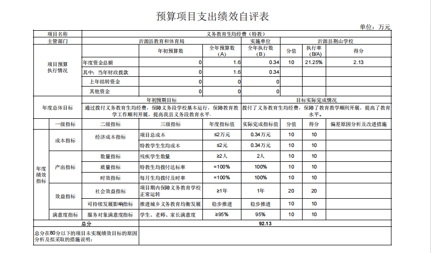 4.“109567沂源县荆山学校_项目义务教育生均经费(特教)”项目绩效自评综述:根据年初设定的绩效目标,项目自评得分为92.13分。全年预算数为1.6万元,执行数为0.34万元,完成预算的21.25%%。项目绩效目标完成情况:拨付了义务教育生均经费,保障了教育教学顺利开展,提高了教育水平。发现的主要问题及原因:执行数执行率有待提高。下一步改进措施:积极按照预算进行支付申请核算。