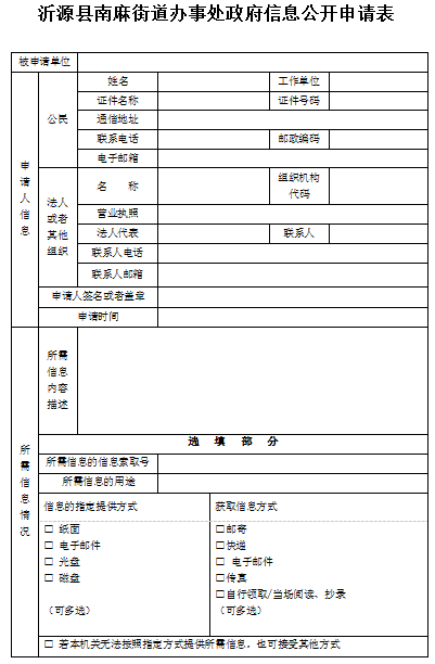 向本机关申请获取政府信息的,应当书面填写《南麻街道办事处信息公开申请表》。《申请表》可以在受理机构处领取,也可以在本机关网站上下载电子版,复制有效。