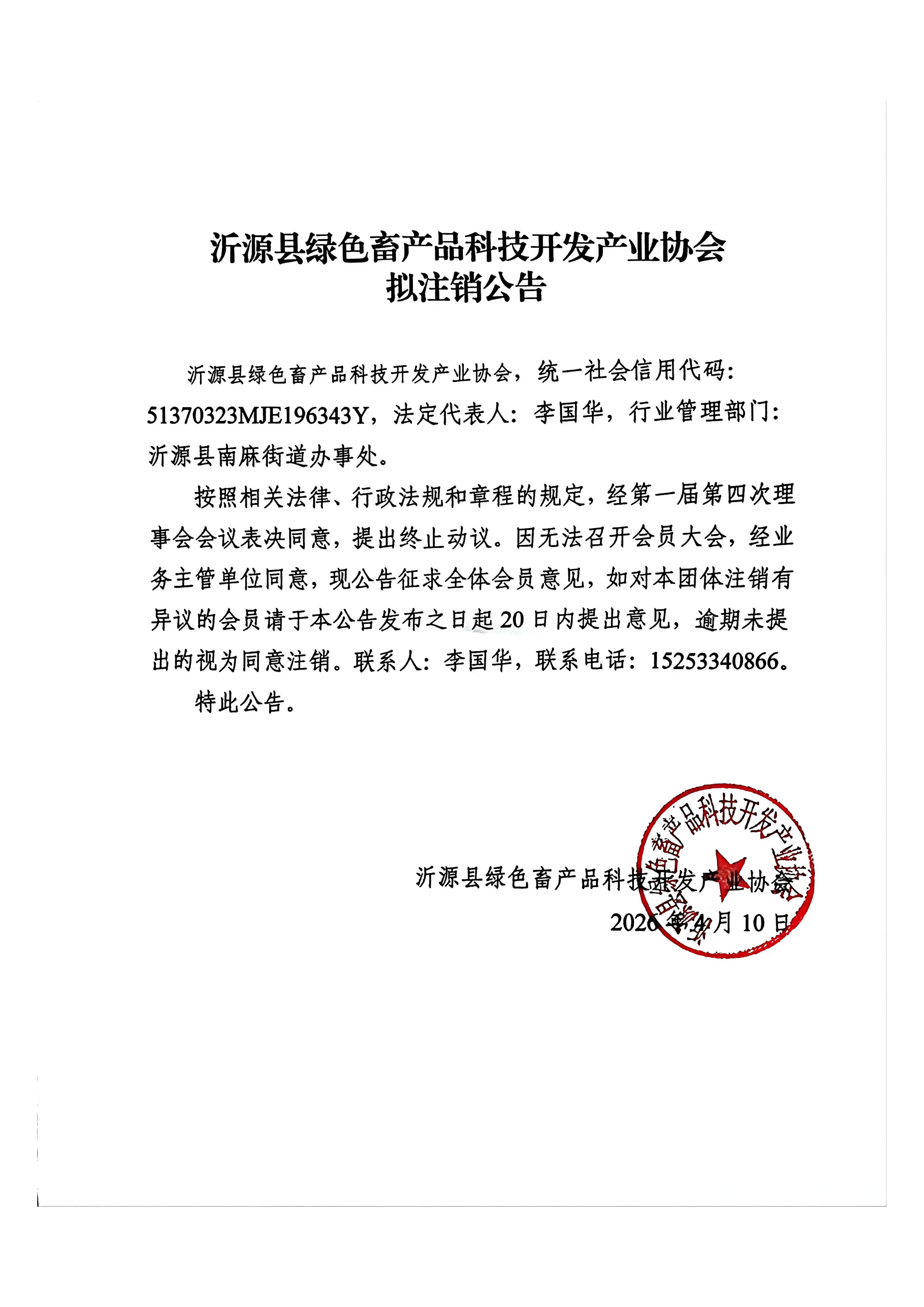 根据《全县性行业协会商会简易注销登记的指导意见(试行)》文件要求,经沂源县绿色畜产品科技开发产业协会申请、业务主管单位(南麻街道办事处)审核,该协会符合简易注销相关条件。