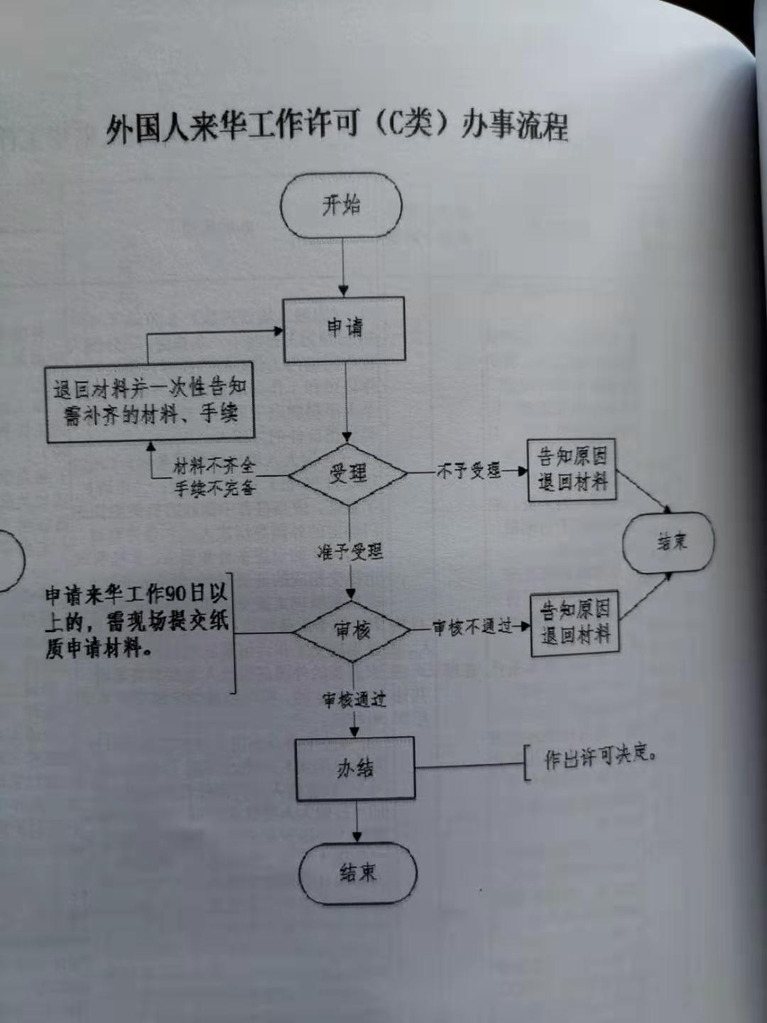 | 审核并办结 | 审核、办结、发证 | 1个工作日 | 用人单位基本条件 1.依法设立,无严重违法失信记录;聘用外国人从事的岗位应是有特殊需要,国内暂缺适当人选,且不违反国家有关规定的岗位;支付所聘用外国人的工资、薪金不得低于当地最低工资标准。 2.法律法规规定应由行业主管部门前置审批的,需经过批准。 二、申请人基本条件 1.应年满18周岁,身体健康,无犯罪记录,境内有确定的用人单位,具有从事其工作所必需的专业技能或相适应的知识水平。 2.所从事的工作符合我国经济社会发展需要,为国内急需紧缺的专业人员。 3.满足国内劳动力市场需求,符合国家政策规定的,具体见外国人来华工作分类标准(试行)。 | 不通过或办结并发证 |