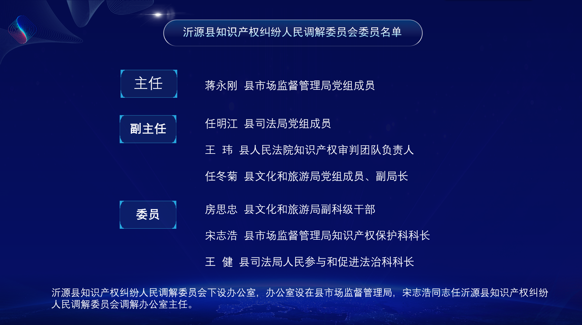 为进一步完善知识产权纠纷多元解决机制,加强行业性、专业性知识产权纠纷人民调解组织建设,营造我县良好营商环境,推进知识产权大保护格局的构建,经研究,决定设立沂源县知识产权纠纷人民调解委员会