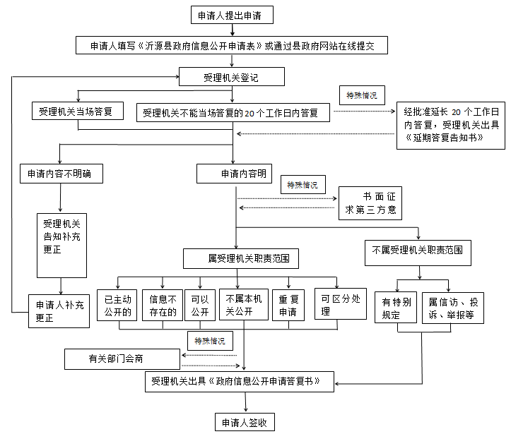 本机关办理申请人政府信息公开申请时,能够当场答复的,将当场答复;不能当场答复的,自收到申请之日起20个工作日内予以答复;确需延长答复期限的,延长答复时间不超过20个工作日,并告知申请人。政府信息涉及第三方权益的,应当征求第三方的意见,征求第三方意见所需时间不计算在期限内。