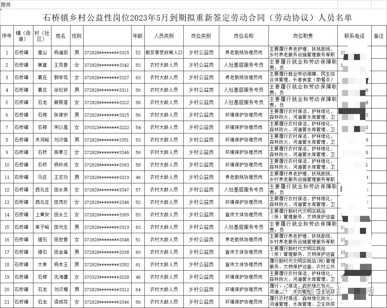 石桥镇2023年5月到期乡村公益性岗位拟重新签订劳动合同(劳务协议)人员公示