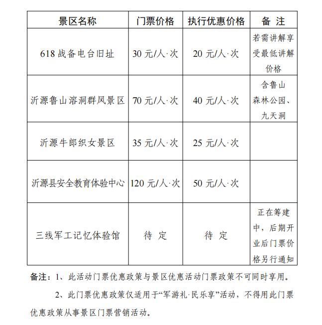2.沂源“军游礼·民乐享”活动景区门票优惠措施