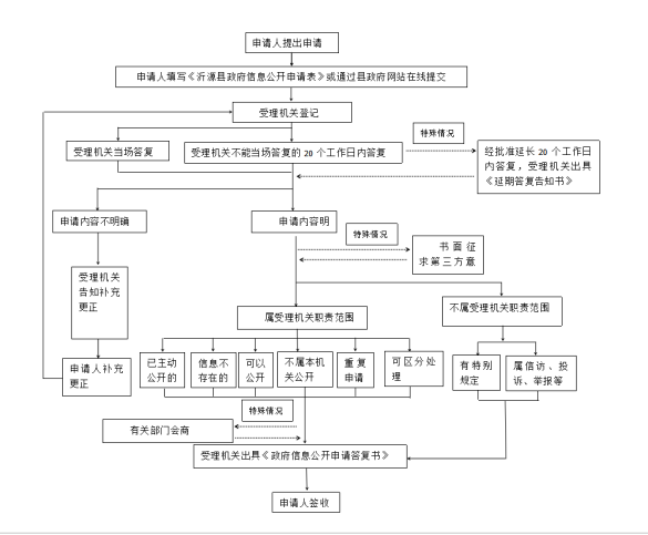 本机关办理申请人政府信息公开申请时,能够当场答复的,将当场答复;不能当场答复的,自收到申请之日起20个工作日内予以答复;确需延长答复期限的,延长答复时间不超过20个工作日,并告知申请人。政府信息涉及第三方权益的,应当征求第三方的意见,征求第三方意见所需时间不计算在期限内。