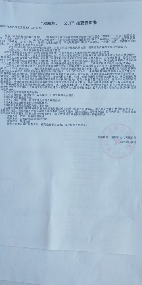 | 任务名称: 沂源县文化和旅游局12月份“双随机、一公开”抽查 |