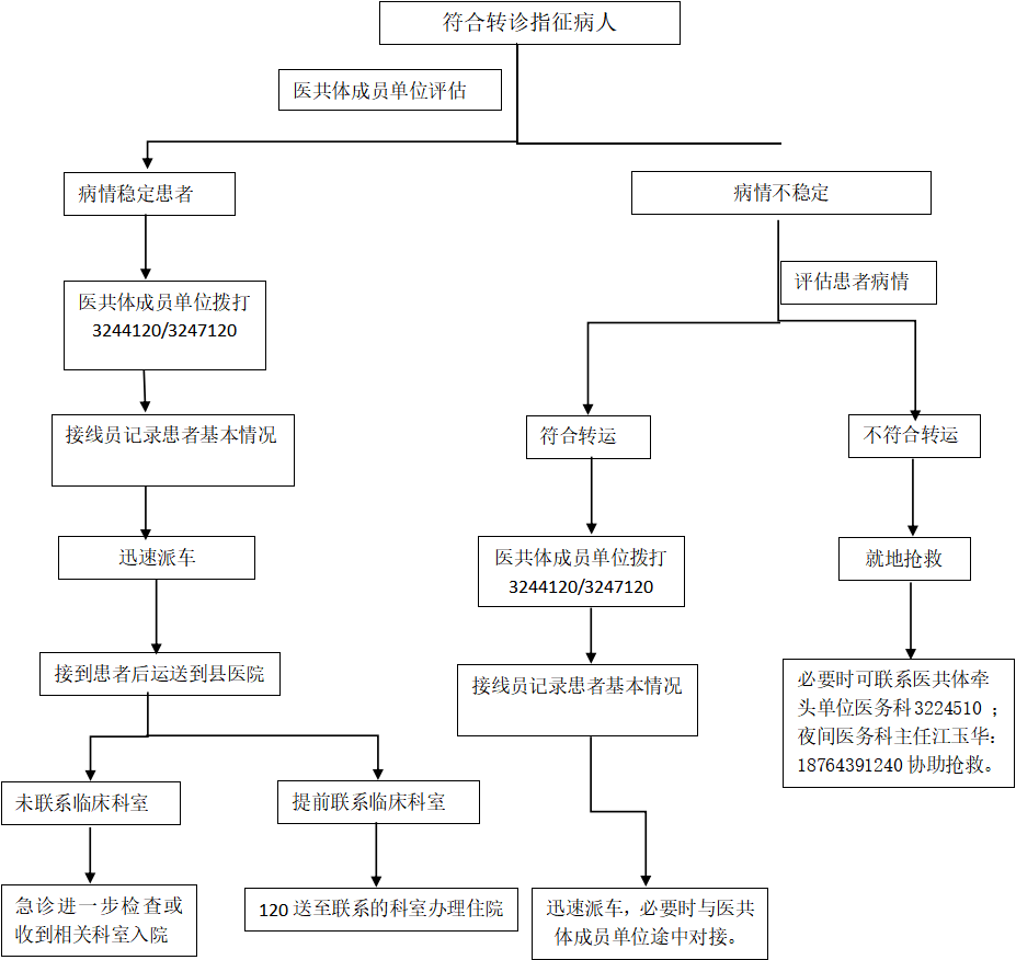 3、患者病情危重不符合转运条件:就地抢救,必要时可联系医共体牵头单位医务科(工作日:0533-3224510 夜间医务科主任江玉华:18764391240)协助抢救。