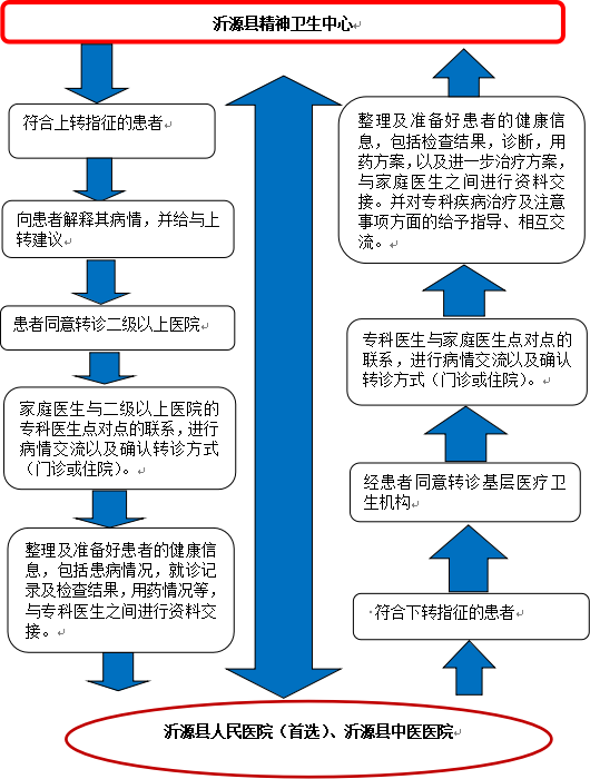 为促进基层首诊,基层医疗卫生机构与二级以上医院医生形成分工协作关系,发挥各自特色专长,建立有效的联动机制,为签约居民提供安全、有效、便捷、经济、有序的医疗卫生服务。有效缓解群众“看病难、看病贵”问题,促进卫生资源合理利用,规范医疗行为,建立有效、严密、实用、畅通的双向转诊治疗渠道,推动南鲁山镇卫生服务工作,根据《山东省家庭医生签约服务指南》(试行),现制定沂源县精神卫生中心与二级以上医院双向转诊工作方案。
