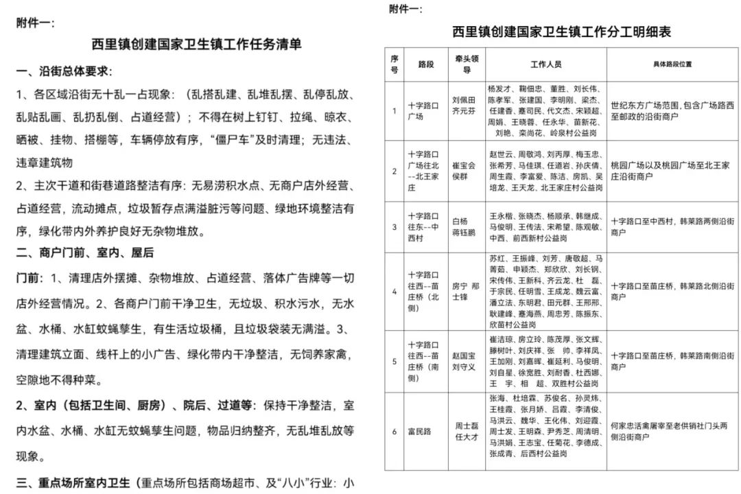 成立工作专班,将全镇机关干部全部纳入创卫活动,成立由镇党委领导班子成员落实、全体干部共同参与的创卫工作专班,召开创建国家卫生镇部署会,将创卫工作网格化,并制定工作任务清单,明确目标分工,细化工作任务,夯实工作责任。