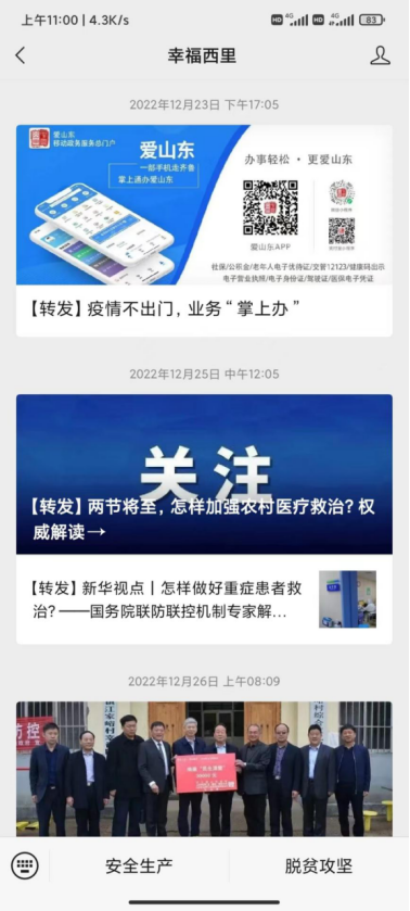 二是充分利用线上线下方式,拓宽信息获取渠道。充分利用微信群、政府新媒体“幸福西里”公众号,及时向村民群众推送政务信息。同时利用好村里“大喇叭”,利用村内广播,将最新最紧急的政策信息及时告知村民。