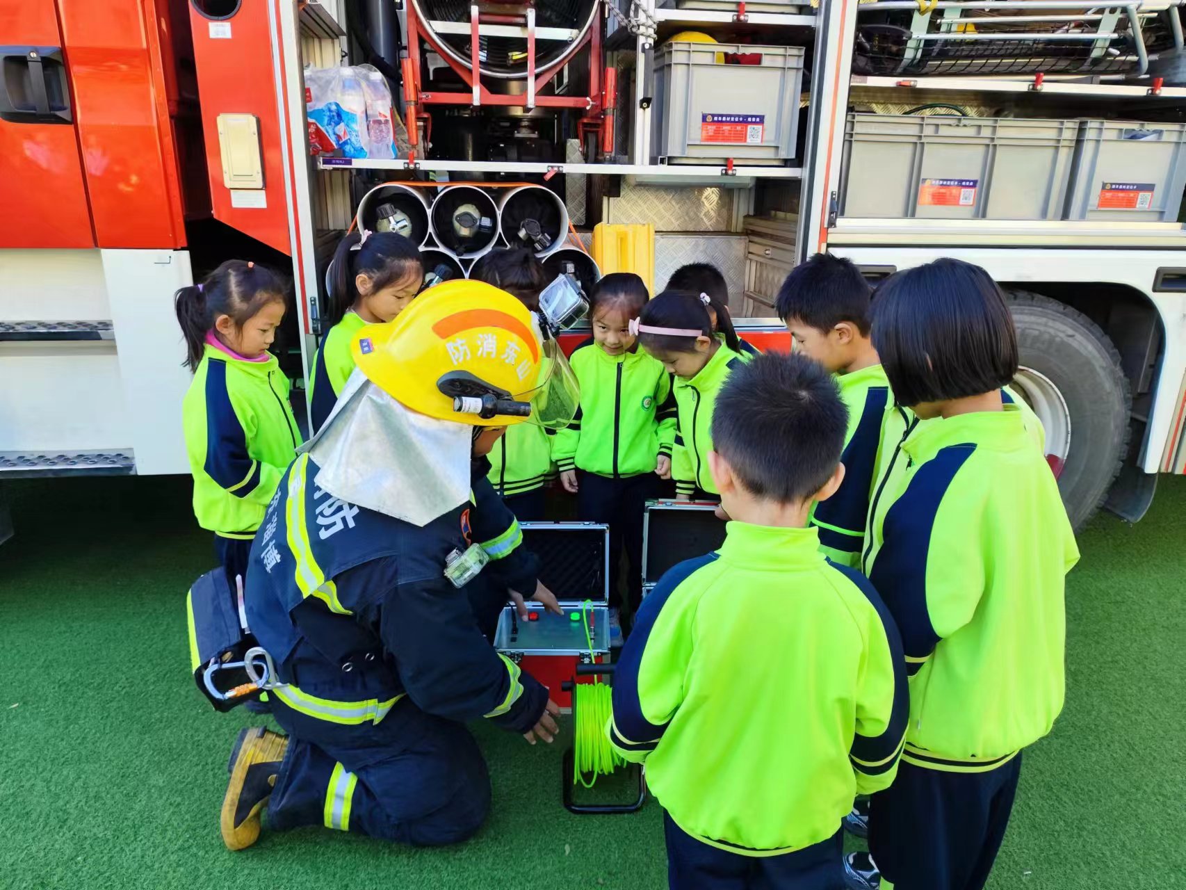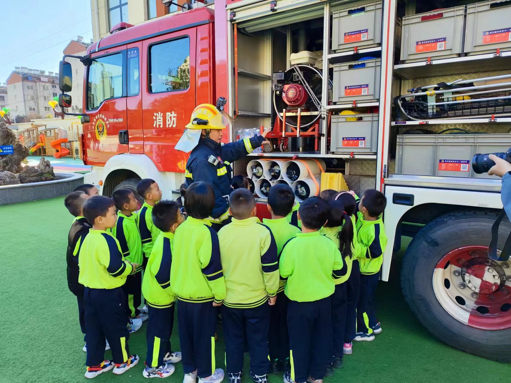 活动现场,首先由县消防救援大队指战员为幼儿园教职工和全体小朋友讲解消防安全知识,并在县消防救援专业人员的引导下,观摩了消防救援装备及车辆。