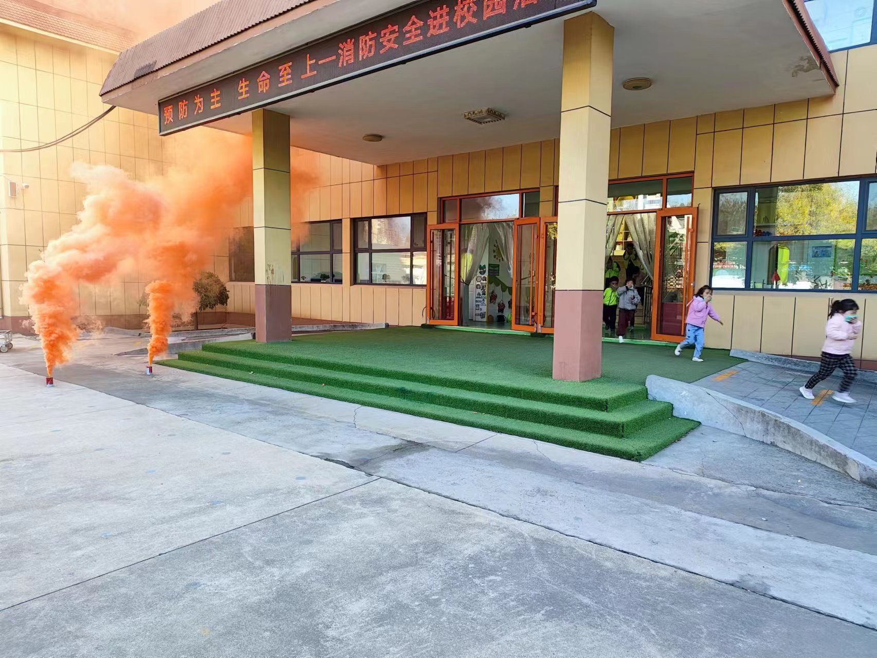 最后,学校开展了火场逃生应急疏散演练,以提高师生在危险面前的反应能力及快速逃生的应变能力。当哨声响起后,老师迅速行动,在维持好秩序的同时,指导小朋友们弯腰低头,尽量将身体放低,用湿毛巾捂住口鼻,一条队伍扶着楼梯,一条队伍扶着墙,中间留出消防通道,沿着孩子们熟悉的逃生路线快速有序地撤离到安全地带。整个过程安全有序、符合实际、达到了预期效果。