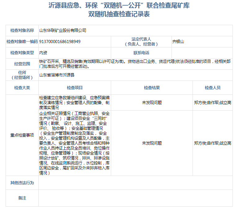 2020年10月19日,根据沂源县应急管理局2020年度“双随机、一公开”抽查工作计划,我局执法人员对山东华联矿业股份有限公司5号尾矿库进行了执法检查,执法人员对该公司的应急救援组织建设、应急预案编制及演练、安全管理人员配备、特种作业人员持证上岗、安全生产教育培训及尾矿库现场进行了检查。经检查,没有发现违法行为。