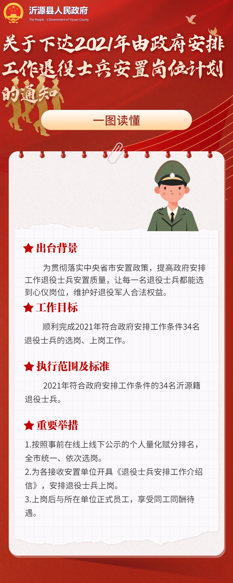【图文解读】沂源县人民政府办公室关于下达2021年由政府安排工作退役士兵安置岗位计划的通知