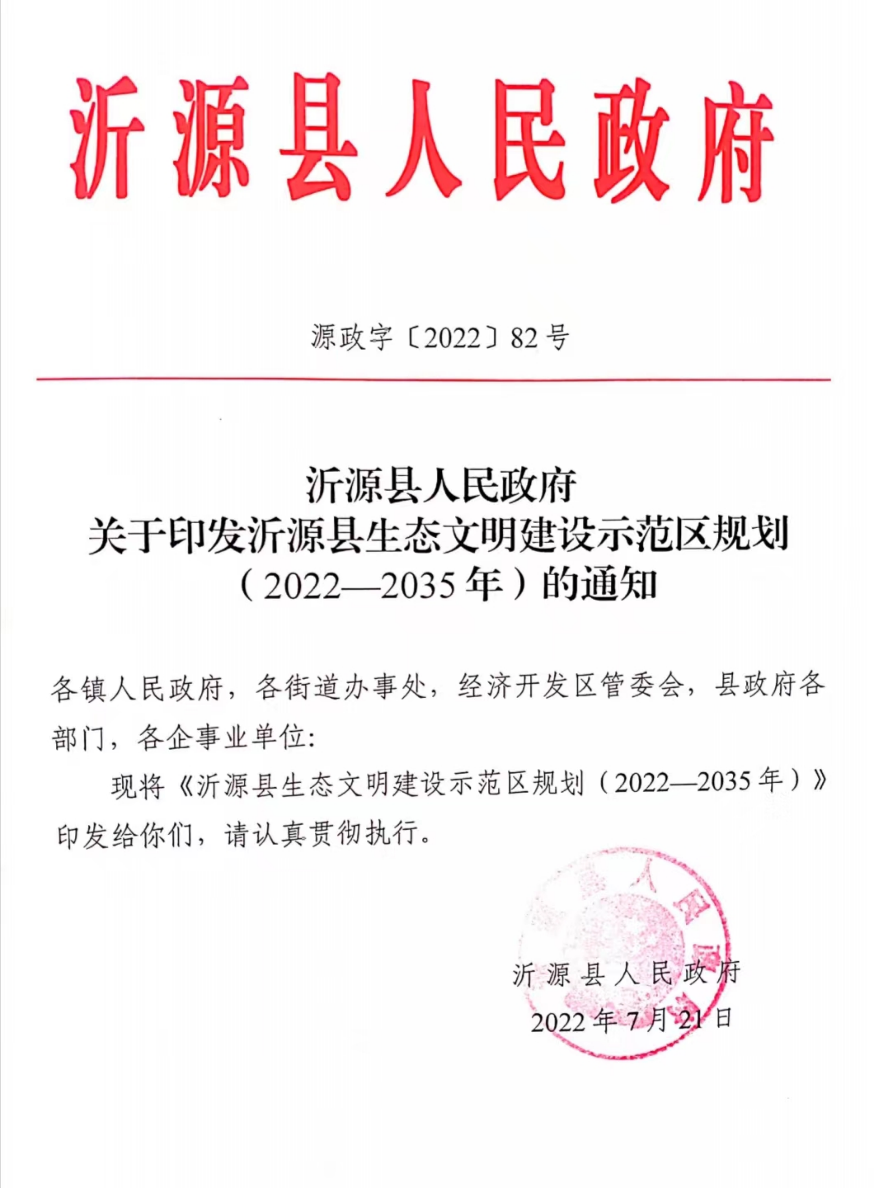 沂源县人民政府关于印发沂源县生态文明建设示范区规划(2022—2035年)的通知