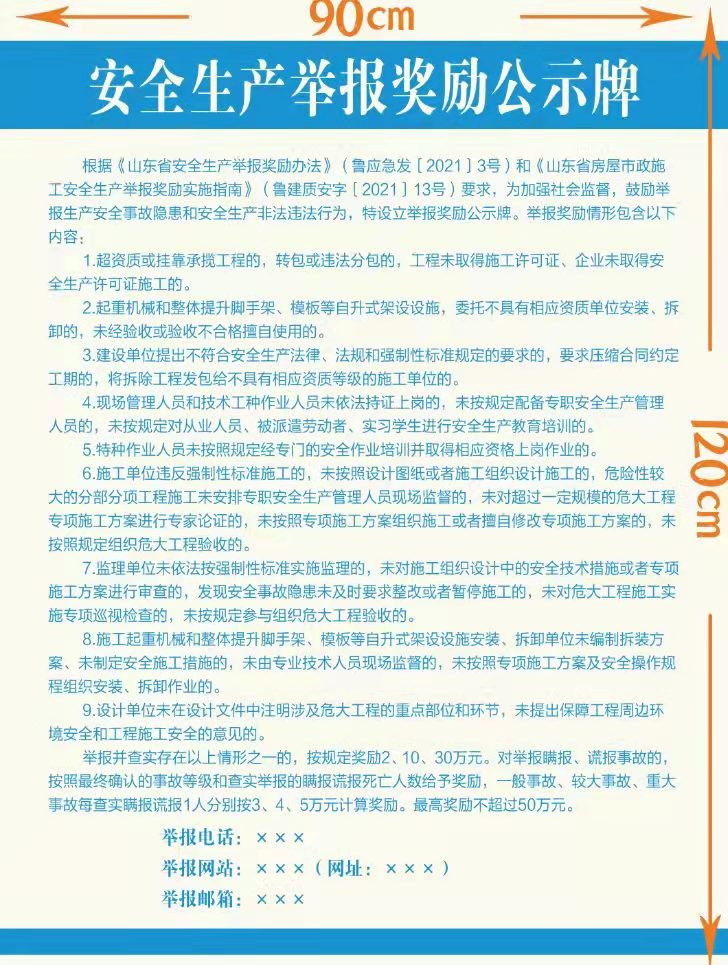 (一)安全生产方面。一是排查起重机械、深基坑、高大模板、脚手架等危大工程安全现状及制度落实情况。二是排查现场使用的机械、设备、设施、电器、临设等安全状况,做好维护保养工作。三是排查“三宝、四口、五临边”防护情况,以及防坠落、防打击、防触电、防火灾等措施落实情况。四是排查进场人员实名制管理制度落实以及宣传教育、培训交底、持证上岗情况。五是工程项目开复工前,施工现场办公室要张贴(挂)《山东省安全生产举报奖励办法》和《山东省房屋市政施工安全生产举报奖励实施指南》,现场要在六牌两图的基础上,增设有奖举报信息牌(样式及要求见附件4),在工程概况图社会监督栏增加有奖举报信息。