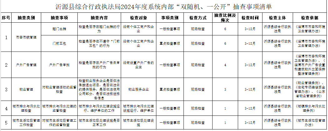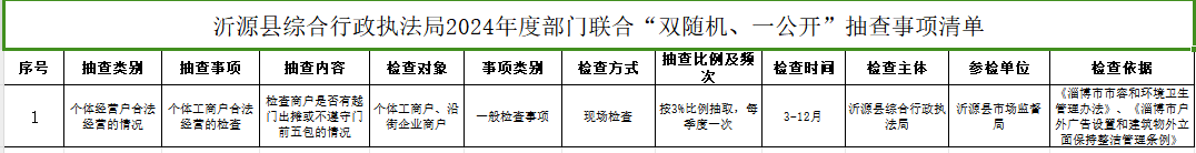 标题: 《沂源县综合行政执法局2024年度“双随机、一公开”随机抽查事项清单》