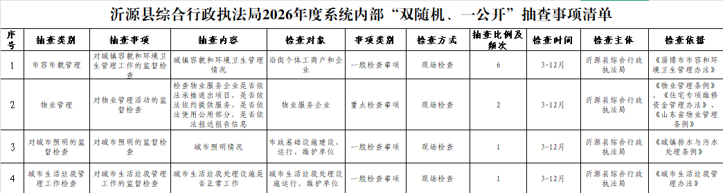 《沂源县综合行政执法局2026年度“双随机、一公开”随机抽查事项清单》