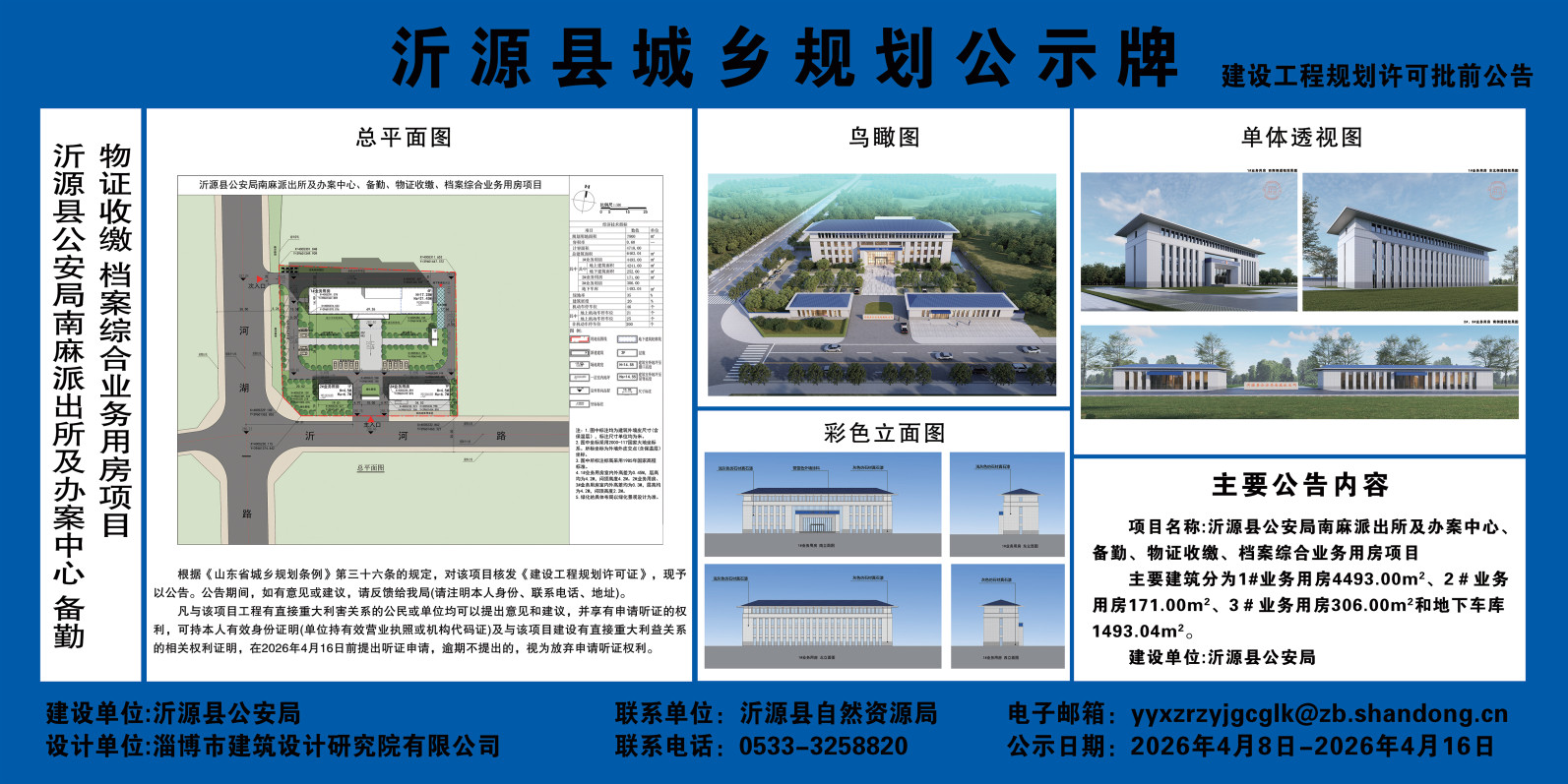 标题: 建设工程规划许可批前公示【2026】沂源县公安局南麻派出所及办案中心、备勤、物证收缴、档案综合业务用房项目