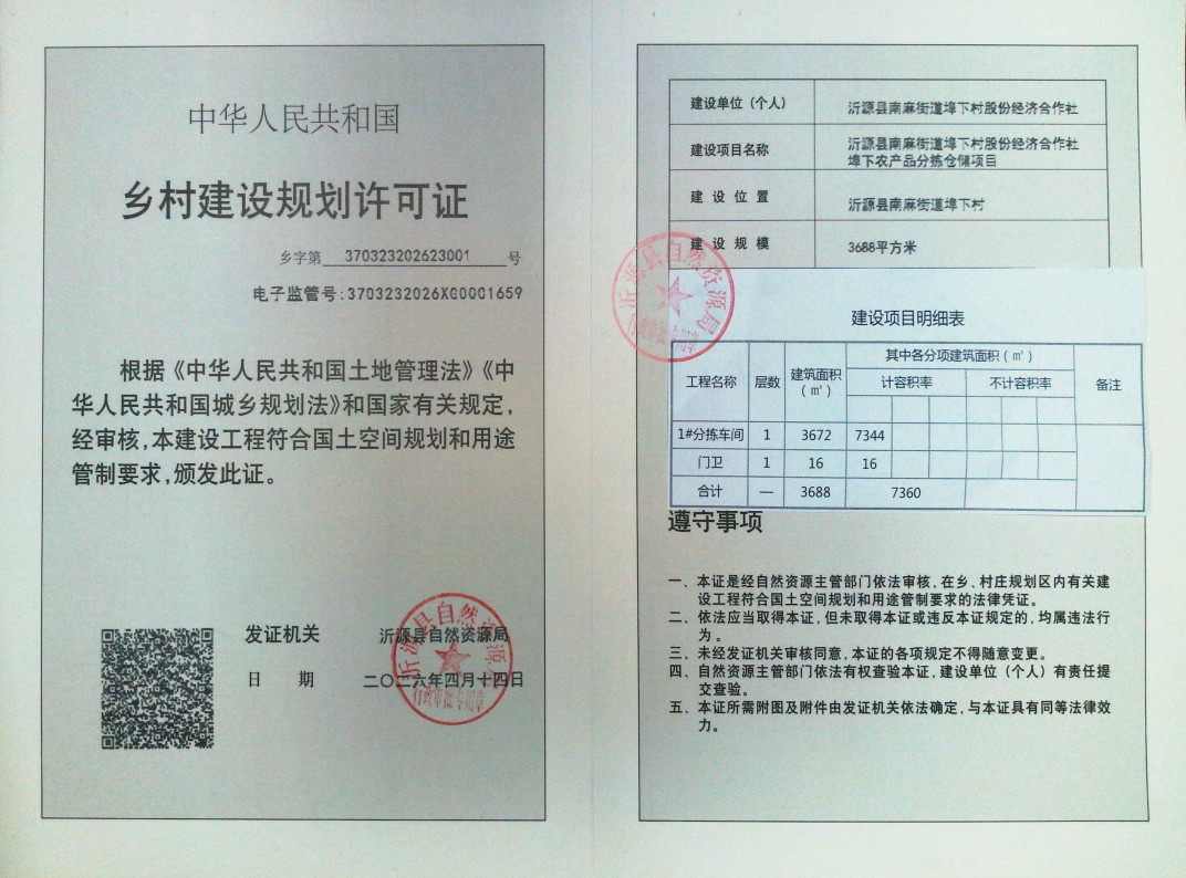 乡村建设规划许可证批后公示【2026-1】沂源县南麻街道埠下村股份经济合作社埠下农产品分拣仓储项目