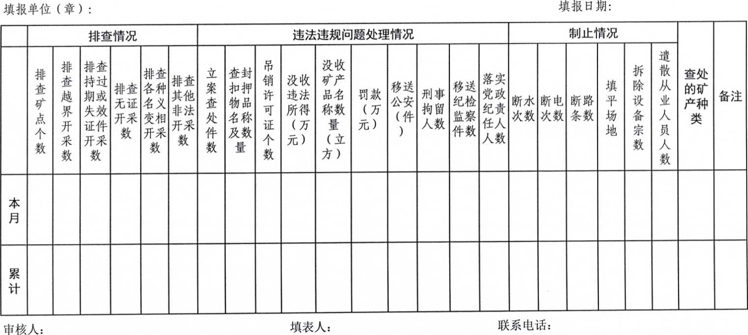 (二) 综合治理阶段(3月至11月)。要集中力量,认真梳理排查近两年下发的季度矿产卫片,结合最新遥感影像,逐图斑比对,发现疑似的问题必须进行现场核验,杜绝发现不及时或死灰复燃等非法开采行为。对已关闭矿山和其他易发生私采滥挖的区域逐一登记造册,落在一张图上,落实具体责任人员,定期进行执法巡查检查,建立巡查检查台帐。结合季度卫片检查和日常巡查,进一步加大巡查检查频率,要集中执法力量对重点区域进行重点巡查、错时巡查检查,实行日常巡查与夜查交叉开展,节假日要安排好值班人员,确保巡查到位,避免出现盲区。在重点区域及周边主要道路卡口,要利用道路监控录像及矿区录像设施,进行实时监控。推广应用视频监控等科技手段,形成“天上看、地上查、群众报”的立体监管体系。对所发现的私采滥挖露天矿山、越界开采矿产资源、非法勘查开采矿产资源等行为,坚持“露头就打”的原则,该查处的及时查处,该立案的及时立案,该追究行政、刑事责任的及时追究,该取缔的立即取缔,该断水、断电、堵路的及时断水、断电、堵路,该注销有关证照的及时注销,该拆除生产设备(施)的立即拆除并清理干净,该撤出生产人员的立即全部撤出,该向上级报告的及时报告。同时,对典型案件要公开查处、曝光,有关责任人员要公开处理,切实发挥警示和震慑作用。各自然资源所每月24日(逢节假日顺延)将本月打击非法开采矿产资源专项整治情况统计表(见附件2、3)报执法大队。县局将对各所专项整治行动开展情况采取“四不两直”方式进行现场督导检查,并及时进行通报。