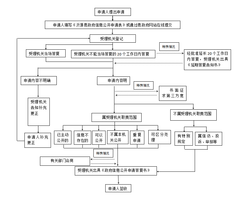 本机关办理申请人政府信息公开申请时,能够当场答复的,将当场答复;不能当场答复的,自收到申请之日起20个工作日内予以答复;确需延长答复期限的,延长答复时间不超过20个工作日,并告知申请人。政府信息涉及第三方权益的,应当征求第三方的意见,征求第三方意见所需时间不计算在期限内。